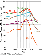 Marriage?(A graph showing the rather dramatic recent declines in rates of marriage.) [Census chart adapted from Scientific American.] |